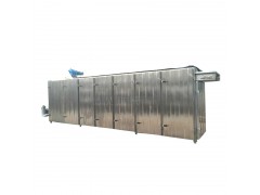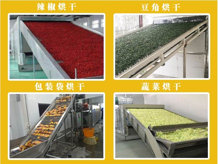 烘干线是将产品输送到密闭的烘干道中,用蒸汽换热增加流量,使产品中水份经过气流被带走从而实现产品烘干的目的。再经过五层长为45米的输送网带,同时产品在输送过程中翻动四次达到烘干均匀的目的