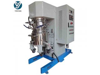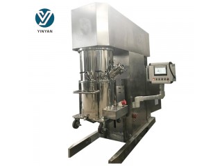 双行星搅拌机工作原理:高粘度搅拌机装有低速搅拌部件和高速分散部件,低速搅拌部件采用行星齿轮传动,搅拌桨在公转时也自转,使物料上下及四周运动,从而在较短的时间内达到理想的混合效果.高速分散部件与行星架一起公转,同时高速自转,使物料受到强烈的剪切与分散混合,其效果为普通混合机的几倍.分散部件分单分散轴和双分散轴,客户可根据需要选用.二个双框搅拌器在桶体同时公转并自转,可实现抽真空,加热,冷却,根据情况可实现转速调节.配多个搅拌桶可1机多桶操作.匹配压料机让出料更方便