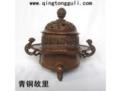 介绍:此熏炉盖上两旁各一条对称的盘龙,穿梭于云海间,中间的一条盘龙为炉钮,炉身是海水纹,炉身两侧各有一条龙,炉由三足,足以大象为饰。