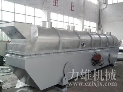 物料自进料进口进入机内,在振动力作用下,物料沿水平面流化床抛掷,向前连续运动,热风向上穿过流化床同湿物料换热后,湿空气经旋风分离器除尘后由排风1:3排出.干燥物料由排料进口排出。