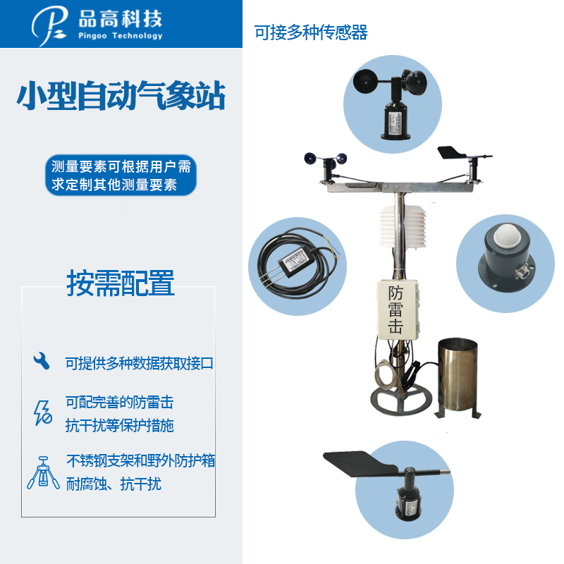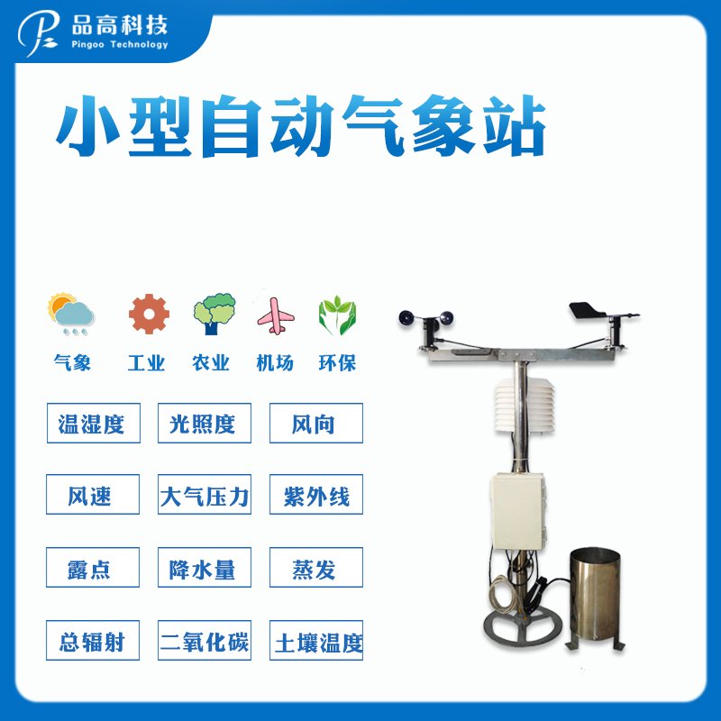 小型气象站用于对风速、风向、雨量、空气温度、空气湿度、光照强度、土壤温度、土壤湿度、蒸发量、大气压力等十几个气象要素进行全天候现场监测。可以通过专业配套的数据采集通讯线与计算机进行连接,将数据传输到气象计算机气象数据库中,用于统计分析和处理。