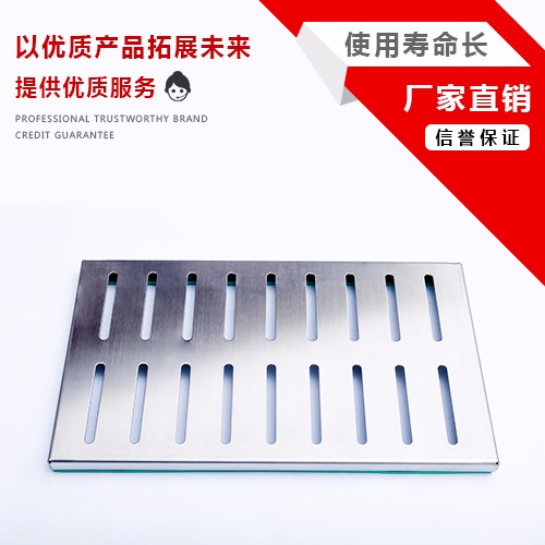 不锈钢水沟盖板采用优质不锈钢板材,经折边,冲压等工艺制作,盖板表面设计有圆形防滑凸点,特别适合油腻湿滑的环境。盖板底部两侧配有防震消音的橡胶垫,坚韧耐用。盖板配有PE材料制成的过滤网,可防堵,防鼠,是厨房的首选盖板,盖板清洗方便,不锈钢材质历久如新!PE落水孔尺寸为13mm*5mm!可有效排水。