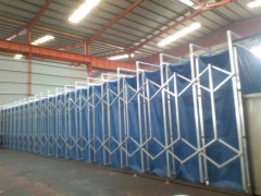 3、伸缩移动喷漆房整体为框架传动结构,每组框架间均有阻燃PVC布密封连接,安装快捷、外形美观,结构精巧,使用方便,制造成本低,节约投资;