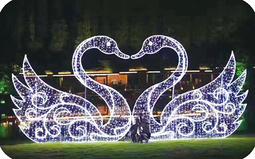 景区内的一座座景观逐渐按照不同的造型,披上不同的灯饰,红、蓝、紫、绿、白等颜色的LDE灯大片大片地覆盖花田,现场五彩缤纷,璀璨夺目,以爱情为主题,展现出温馨浪漫的情景。