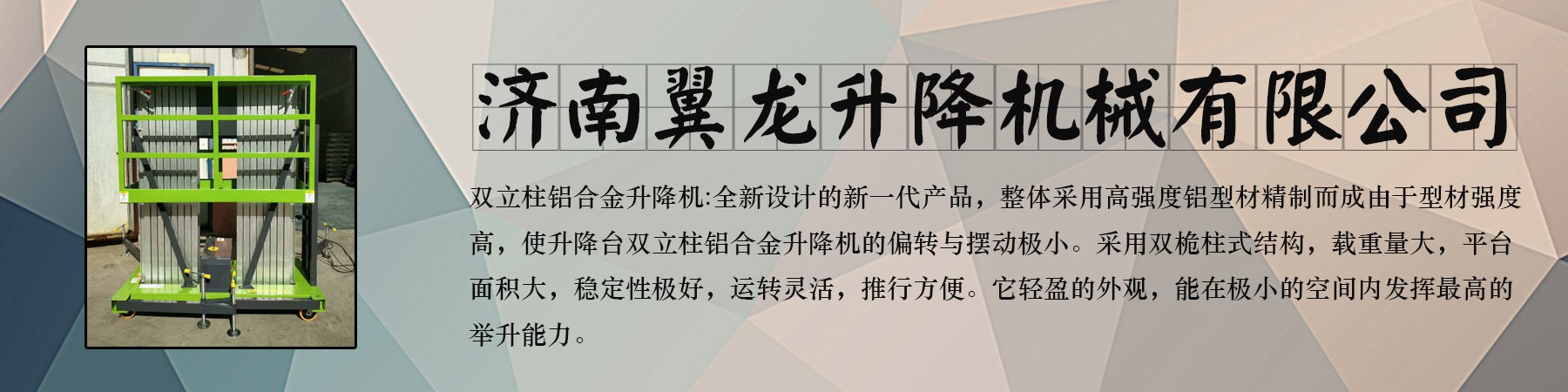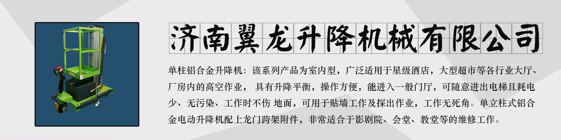 济南翼龙升降机械有限公司本着以优质的产品质量争取市场,以优质的售后服务体系赢得客户的宗旨,不断扩大发展,力争成为液压升降机械行业的领头企业。 本公司生产的产品,主要产品分为曲臂式升降机、导轨式升降机、全自行升降机、登车桥、单立柱铝合金,双立柱铝合金,三立柱铝合金、四立柱铝合金,移动式升降机、自行式升降机、固定式升降机、折臂式升降机、油缸链条导轨式升降机、升降平台及物流装卸平台固定式登车桥、移动式登车桥,八大系列六十个品种。我厂设备均可按照您的要求定做本公司生产设备精良、工艺先进、检测手段齐全、技术力量雄厚,所有产品性能优越、质量更稳定。本公司生产的产品,广泛用于建筑工地、电力、通信、机场、会展中心、超市、工厂流水线、车站、码头、地铁、宾馆等场所.