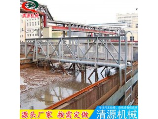 本设备由四点支撑行走大梁横跨在平流式沉淀池上,双边驱动,池两边均铺设钢轨,从池的一端运行到池子的另一端,边行走边刮泥,撞到行程控制,折返行走,完成一个工作周期。桁车式刮泥机的特点: