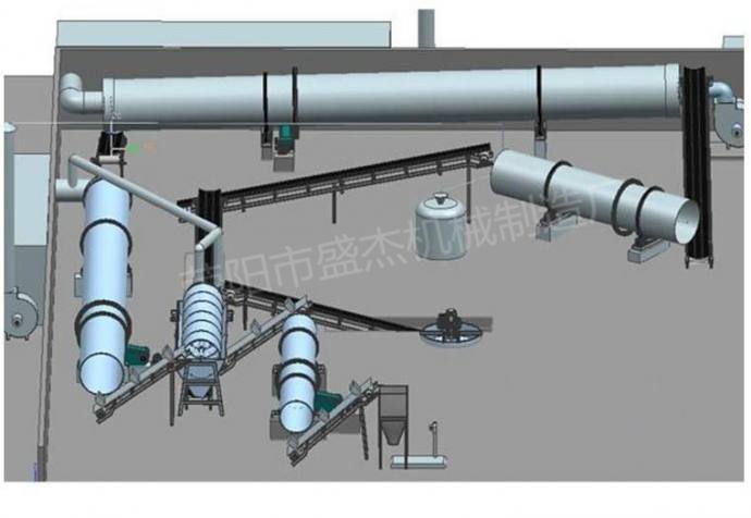 中配置:发酵翻抛机、铲车料仓、半湿物料粉碎机、卧式搅拌机、造粒机、烘干机、冷却机、滚筒筛分机、包装设备、皮带输送机等。
