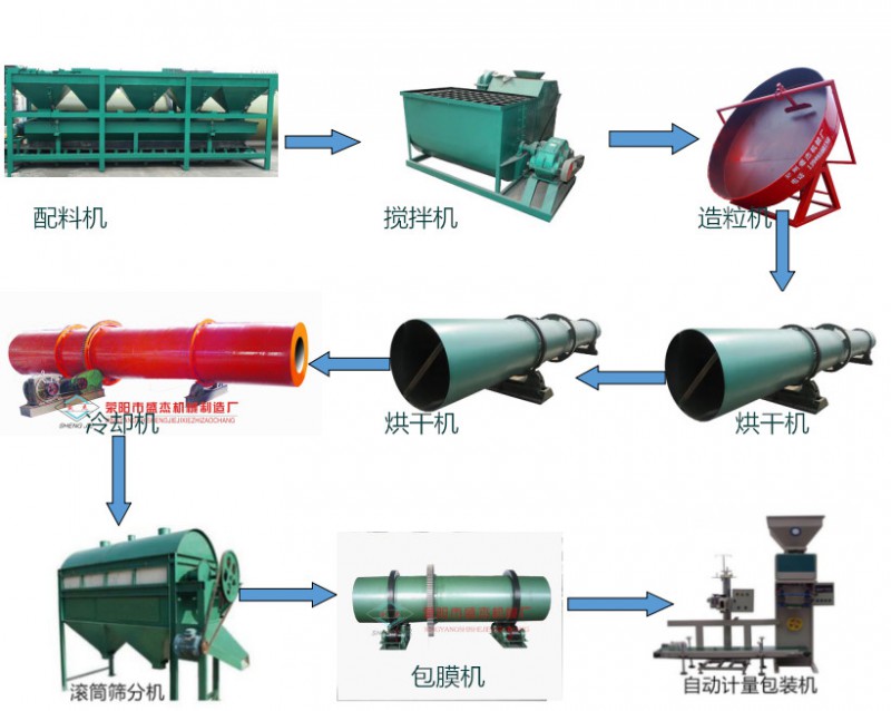 低配置:发酵翻抛机、铲车料仓、半湿物料粉碎机、卧式搅拌机、造粒机、烘干机、滚筒筛分机、包装设备。