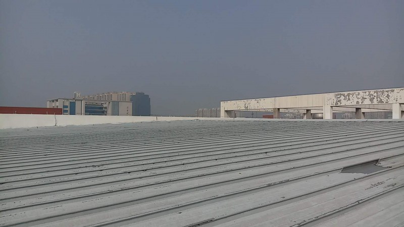 占地面8400平米,分三个区域。屋面采用900型冲孔板为底板,中间加100厚玻璃丝棉,屋面板为65-430型铝镁锰板,四周女儿墙用铝板包边,工期2个月。