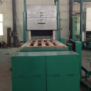 在炉体前部和后部及左侧(或右侧)部份分别设有底盘回转装置,在前、后回转架上分别设有回转小车,供承载底盘和壳型传送体用。底盘回转情况如下:先将壳型取走,然后将炉内底盘拉出炉体外至后回转小车上并关闭前炉门,由人工将回转小车及回转小车上的底盘及壳型传送体移至另一端,再将底盘及壳型传送体人工推送到左侧回转架上,然后将回转小车由人工送至后炉口,同时将底盘及壳型传送体移至左侧回转架的另一端,并推送到后回转架上的回转小车上,并由人工将回转小车连同底盘及壳型传送体推至后炉口,待壳型放入壳型传送体上时,开启炉门,再开启电动液压推杆,推送底盘连同壳型传送体一起至炉膛内进行焙烧。