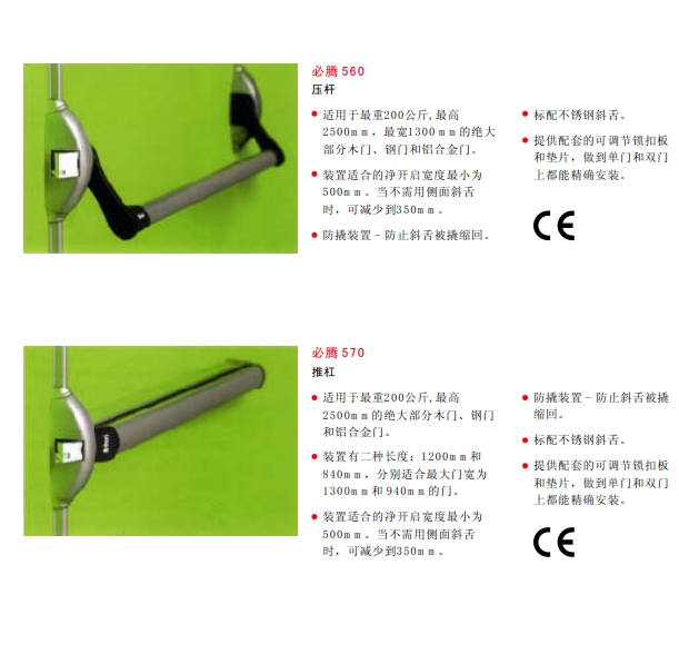 符合标准:EN1125每一处新建或更换的应急逃生装置都要求符合欧洲安全法。欧洲标准EN1125 涉及为公众使用的大楼应急逃生装置,使人们能“以最小的努力而不必事先了解产品操作知识,从门通道安全有效地逃生”。必腾560和570 应急逃生装置带有C E 标记,显著表示产品通过最新欧洲标准EN1125的单独测试和评估。并且通过EN1634的防火测试。通过国标GB/T7106-2008正负5000帕抗分压测试