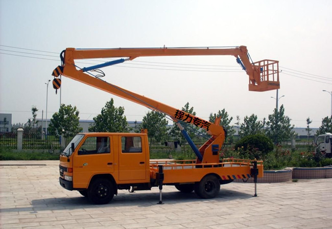 三节折臂液压举升装置,采用国产、进口换向阀及液压油缸,换向平稳,操作方便灵活,转台、工作斗双工位操作,支腿与工作臂互锁,安全可靠,防止误操作,系统设过载保护阀,油压超过定值自动卸载。H型支腿,跨距大,稳定性好,支腿即可独立伸缩,又可联动,装有支腿爆闪灯,用于支腿示廓,发出光报警信号。工作斗自动调平,外置拉杆强制平衡,作业范围大,带1吨吊钩,360度连续旋转,工作斗最大载荷200KG。