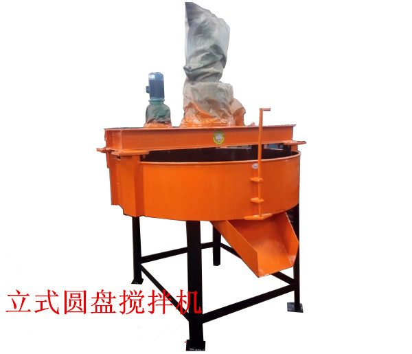 立式圆盘搅拌机由搅拌盘、出料口、搅拌臂、机架、齿轮箱包以及传动机构组成,其特征是搅拌盘中央设置有一圆筒,圆筒上设置有一圆筒盖,搅拌臂固连在圆筒盖上,搅拌轴联接圆筒盖的一端穿过圆筒,搅拌轴带动圆筒盖转动,从而带动搅拌臂转动,带动搅拌轴转动的传动机构由四级传动构成。该搅拌机寿命长、节能省电、体积小、搅拌速度快、可连续不断工作,特别适合有机肥原料搅拌使用。