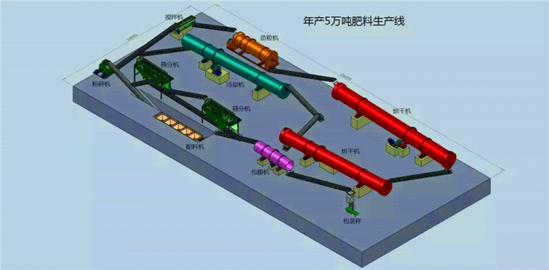 一般原料发酵之后,可直接深加工造粒。如果原料没经过处理,参照以上方法发酵,整套设备需要发酵翻抛机、半湿物料粉碎机、滚筒筛分机、卧式搅拌机、圆盘造粒机、烘干机、冷却机、滚筒筛分机、包膜机、自动定量包装机等设备。