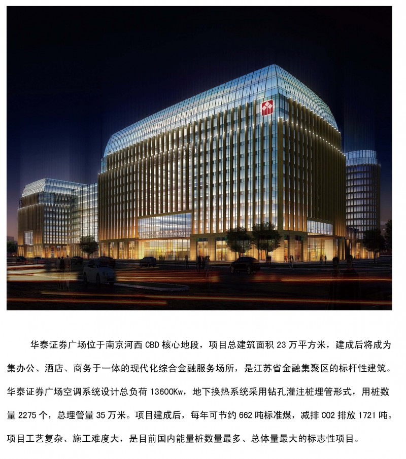 华泰证券广场位于南京河西CBD核心地段,项目总建筑面积23万平方米,建成后将成为集办公、酒店、商务于一体的现代化综合金融服务场所,是江苏省金融集聚区的标杆性建筑。华泰证券广场空调系统设计总负荷13600Kw,地下换热系统采用钻孔灌注桩埋管形式,用桩数量2275个,总埋管量35万米。项目建成后,每年可节约662吨标准煤,减排CO2排放1721吨。项目工艺复杂、施工难度大,是目前国内能量桩数量最多、总体量最大的标志性项目。