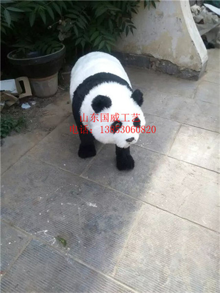 大熊猫体型肥硕似熊、丰腴富态,头圆尾短,头躯长1.2-1.8米,尾长10-12厘米。体重80-120千克,最重可达180千克,饲养的熊猫略重,一般雄性个体稍大于雌性。头部和身体毛色黑白相间分明,但黑非纯黑,白也不是纯白,而是黑中透褐,白中带黄。秦岭地区的个体偏大,体毛粗糙,腹毛略呈棕色色泽。岷山(尤以青川平武)则个体较小,体毛也较前者为细,腹毛棕色不明显,但凉山的个体并不偏小。仿真大熊猫模型的制作分内胎和外胎两个结构,内胎采用优质聚乙烯原材热熔压制,一体注塑而成,使仿真大熊猫模型具有良好的防水性能。一体注塑的优势在于没有人工接痕,使大熊猫模型更加坚固从而延长使用寿命。外胎采用优质大熊猫皮毛或者人造毛绒无缝贴合,使大熊猫模型更加形象逼真。订做仿真大熊猫模型,请找山东国威工艺 ,质优价廉,可根据客户要求订做。