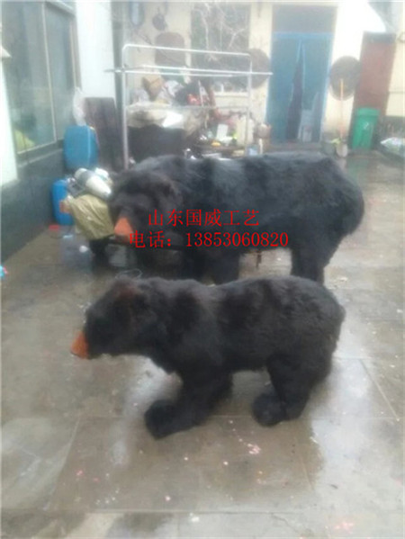 黑熊的头骨略呈长圆形,与棕熊相比,前短后长。吻部较短,鼻骨长度约等于头骨在第一上臼齿前的横宽;眼眶前缘至中央门齿齿槽前缘的距离小于左右眶后突之间的距离,额骨平缓,中央不下陷。顶骨较宽;即使老龄个体也达不到顶骨的三分之一处;乳状突很发达,致使头骨后部显得宽大。颧弓较弱。腭骨延伸到后臼齿的后面。鼓室扁平。下颌骨短,最后下臼齿位于眼窝前缘的后边。仿真黑熊模型的制作分内胎和外胎两个结构,内胎采用优质聚乙烯原材热熔压制,一体注塑而成,使仿真黑熊模型具有良好的防水性能。一体注塑的优势在于没有人工接痕,使黑熊模型更加坚固从而延长使用寿命。外胎采用优质黑熊皮毛或者人造毛绒无缝贴合,使黑熊模型更加形象逼真。订做仿真黑熊模型,请找山东国威工艺 ,质优价廉,可根据客户要求订做。