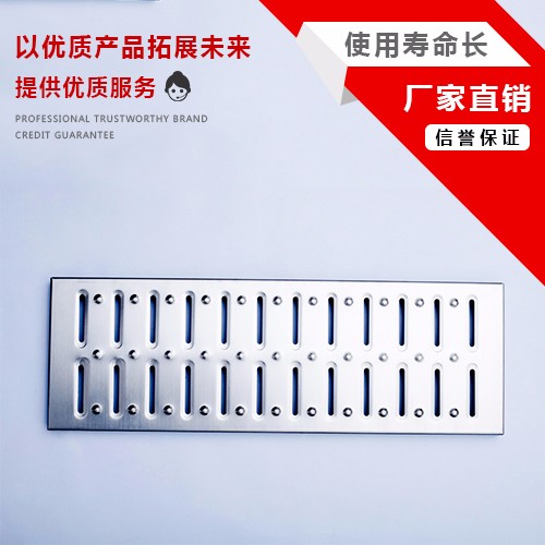 不锈钢水沟盖板采用优质不锈钢板材,经折边,冲压等工艺制作,盖板表面设计有圆形防滑凸点,特别适合油腻湿滑的环境。盖板底部两侧配有防震消音的橡胶垫,坚韧耐用。盖板配有PE材料制成的过滤网,可防堵,防鼠,是厨房的首选盖板,盖板清洗方便,不锈钢材质历久如新!PE落水孔尺寸为13mm*5mm!可有效排水。
