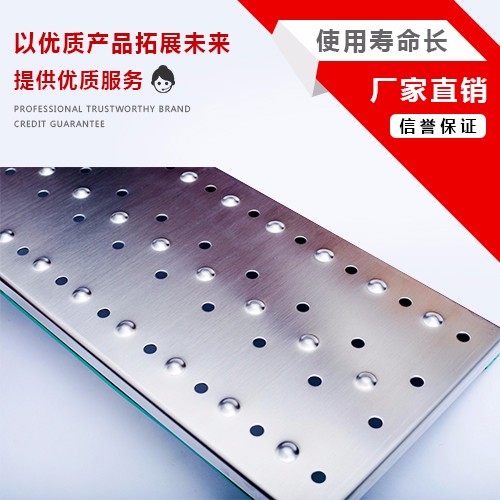 不锈钢水沟盖板采用优质不锈钢板材,经折边,冲压等工艺制作,盖板表面设计有圆形防滑凸点,特别适合油腻湿滑的环境。盖板底部两侧配有防震消音的橡胶垫,坚韧耐用。盖板配有PE材料制成的过滤网,可防堵,防鼠,是厨房的首选盖板,盖板清洗方便,不锈钢材质历久如新!PE落水孔尺寸为13mm*5mm!可有效排水。