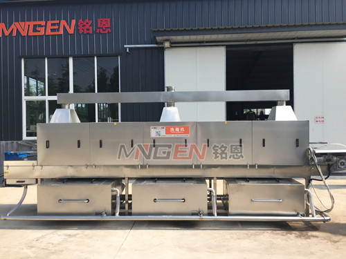 全自动高压喷淋塑料筐子清洗机_周转筐清洗设备分四段组成,热碱水段、热水段、蒸汽杀菌段、风干段等几部分组成,设备除轴承之外其他均采用优质SUS304不锈钢制作,采用高压喷淋热水水浴清洗,各个循环水箱均采用卧式不锈钢离心水泵循环喷淋,从上、下、左、右四个方向同时对周转筐进行喷淋冲洗;每个水箱均设有二道过滤装置,便于随时清理赃物;各个水箱设单独排污清理阀,排出后有截管同一排放。热碱水箱及热水箱内设有蒸汽加热管两水箱内水温自动控制,常温至80℃(可调)任意设定;设备清洗能力大,除油污效果好,洗净率高,经过输送网带,传送至高压喷淋清洗经自来水喷淋清洗后自动输出。蒸汽杀菌段安装蒸汽管道,通过管道直接喷射蒸汽对周转筐进行高温杀菌。
