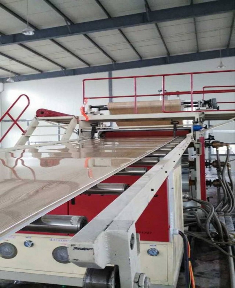 13328115976博宇公司石塑SPC地板机械设备,PVC石塑地板生产线 ,新研发多层PVC石塑地板生产线工艺技术,挤出基材、浮雕木纹层、彩膜层、耐磨层、底层消音层五合一PVC地板生产线;PVC石塑地板生产线由自动上料进入高速混合机,、再自动上料到双螺杆挤出机、由大板模具结构出料进行三辊定型模定型(其间表面多层膜同时进入三辊热粘合于一体),排辊托架冷却装置、裁边装置、牵引机、自动切割机、自动抬板机等组成。机组结构紧凑,性能优越。螺杆、料筒经优化设计,并采用高性能双合金钢专业加工 ,使整机具有塑化均匀,挤出量稳定,产量高,寿命长等优点。主机料筒采用铸铝加 热器加温,风冷却,精密电脑屏控制温度。精密的定型压光装置,通过其良好的调整功能使板材定型优良。切割部分采用定长切割装置,保证板材长度精确 。