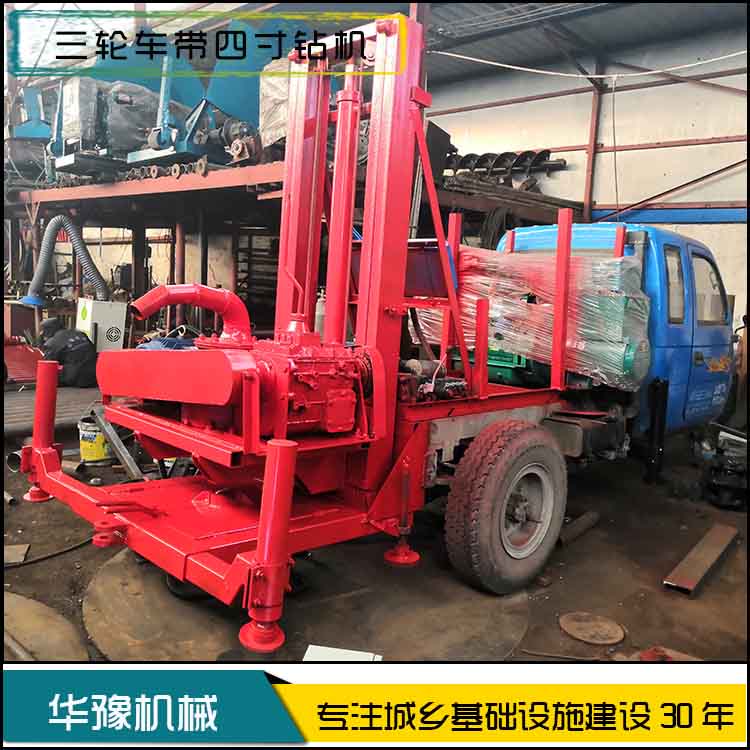 四寸正循环打井机可以选用二手三轮车和全新三轮车,客户可以自己配,也可以在我们这边配。钻杆可以放到三轮车上。