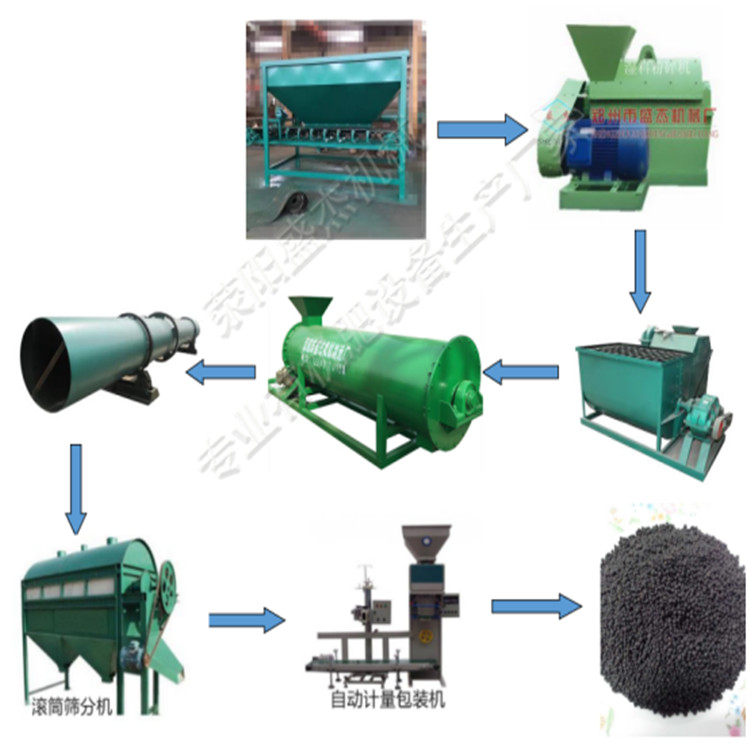 成套设备包括:半湿物料粉碎机→卧式搅拌机→造粒机→烘干机→冷却机→筛分机→包装机等相关设备,设备之间由皮带机或螺旋输送机传送物料。