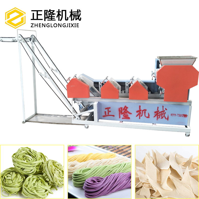 面条机的工作原理是把面粉经过面辊相对转动挤压形成面片,再经前机头切面刀对面片进行切条,从而形成面条。面条的形状取决于切面刀的规格,所有机型均可安装不同规格的切面刀,故一台机器经过更换不同规格的面刀可以做成各种规格的面条。(全自动挂面机),是一种新型面条流水线设备,该机从进料到出面连续作业,具有高产高效、省时省力、操作简便等优点,生产的面条韧性好、口感好。中型面条机的特点为:该轧辊表面经过磨床精磨,光滑美观,轧出的面带均匀光洁,保证了良好的挂面质量本机设计合理,采用排列式,减速机和链轮传动,噪音小,结构紧凑,人性化设计,工作省力。