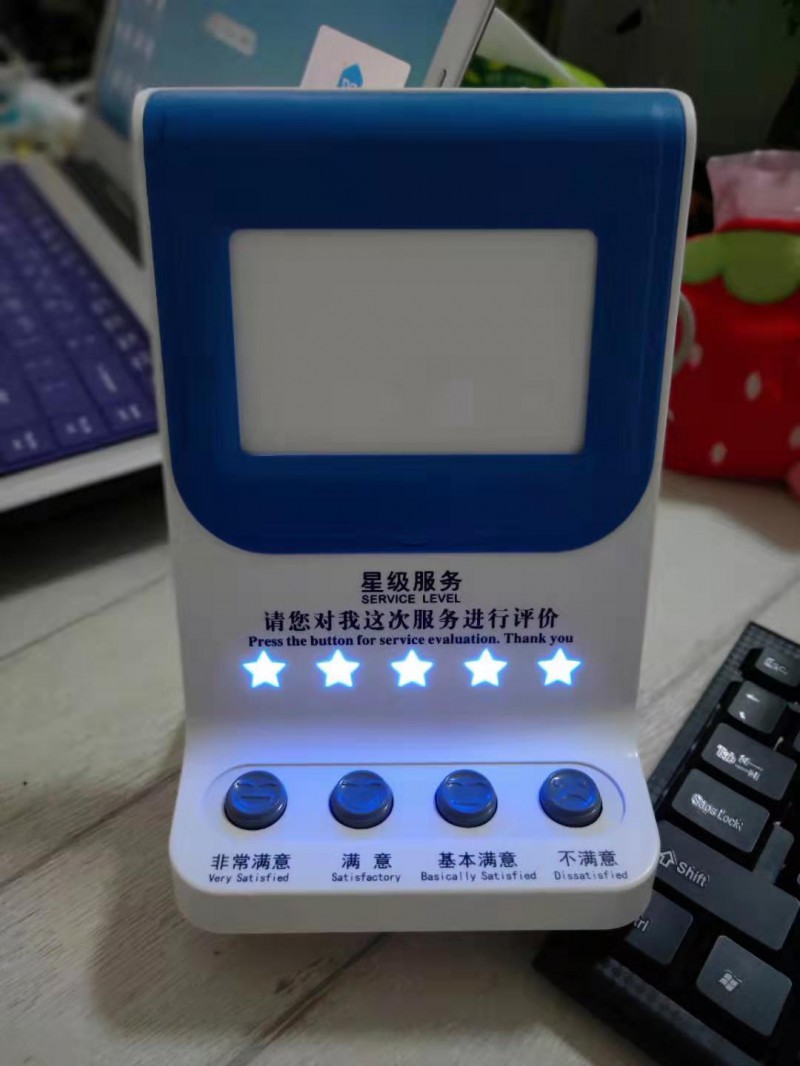 4、4个标准评价按键设计,评价项目包括“非常满意”、“满意”、 “一般”、“不满意”,按键数量和按键内容支持定制(3、5、6按键数量)。