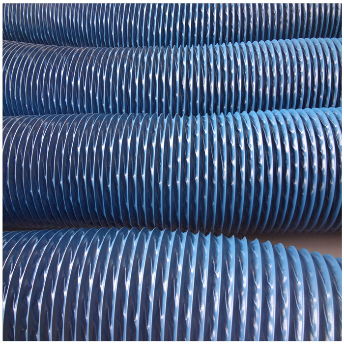 蓝色钢丝风管可使用在100度左右的环境中,抗撕裂,耐高温,耐酸碱,可抽风不被吸扁,不漏风,不渗水,不结露,在高端焊烟净化除尘器设备及高档场地大量应用。