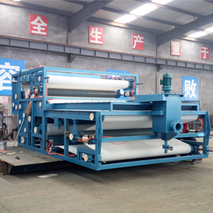 该系列压滤机由导向导辊,压榨辊和上下滤带及滤带张紧、纠偏、冲洗、调整等装置组成。其压榨辊呈S状布置,并且压榨辊直径由大而小排列,使滤带与压榨辊接触面大,压榨时间长,污水受到的压力较小而缓合。上下滤带以相同方向,相同速度运行,靠滤带的张力产生对污泥的压力和剪切力把污泥中的毛细水挤压出去,达到污泥脱水之目的。