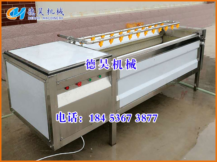 本机适用于天麻,葛根,人参,桔梗,甘草,等中草药以及土豆、胡萝卜、芋籽,地环,洋姜等不许损伤表皮的球状(圆柱状)果蔬中草药等物料,下部采用毛刷将物料表面刷洗干净,上部有高压喷淋清洗,前段采用循环水,后段采用净水,果蔬清洗彻底且节约用水。也可选用加硬的毛刷对土豆,芋头,洋姜等物料进行去皮清洗。