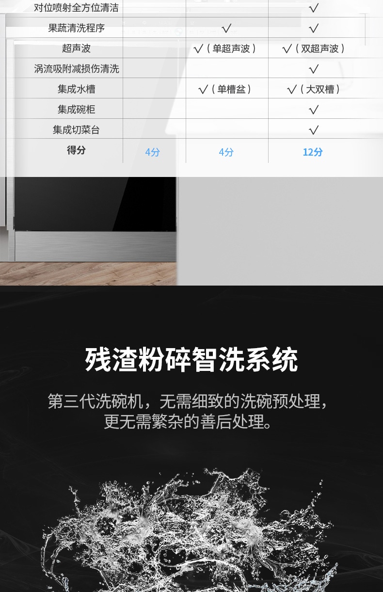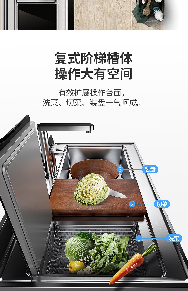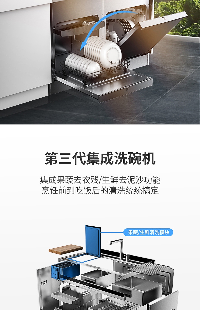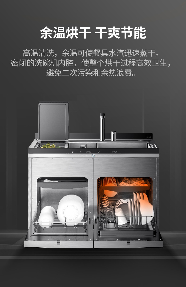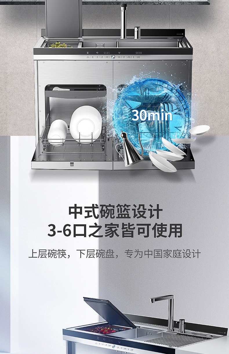 水槽洗碗机开创性地将洗碗机、水槽、果蔬清洗机三种产品形态整合于一身:将传统洗碗机的空间留给了其他厨电用品,极大提升了厨房利用效率;水槽一体化安装,不拆橱柜,不改水电,利用原有水槽,安装便利,节省工程成本。一台厨电,三种用途