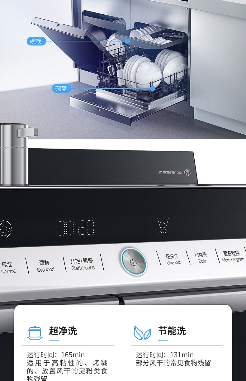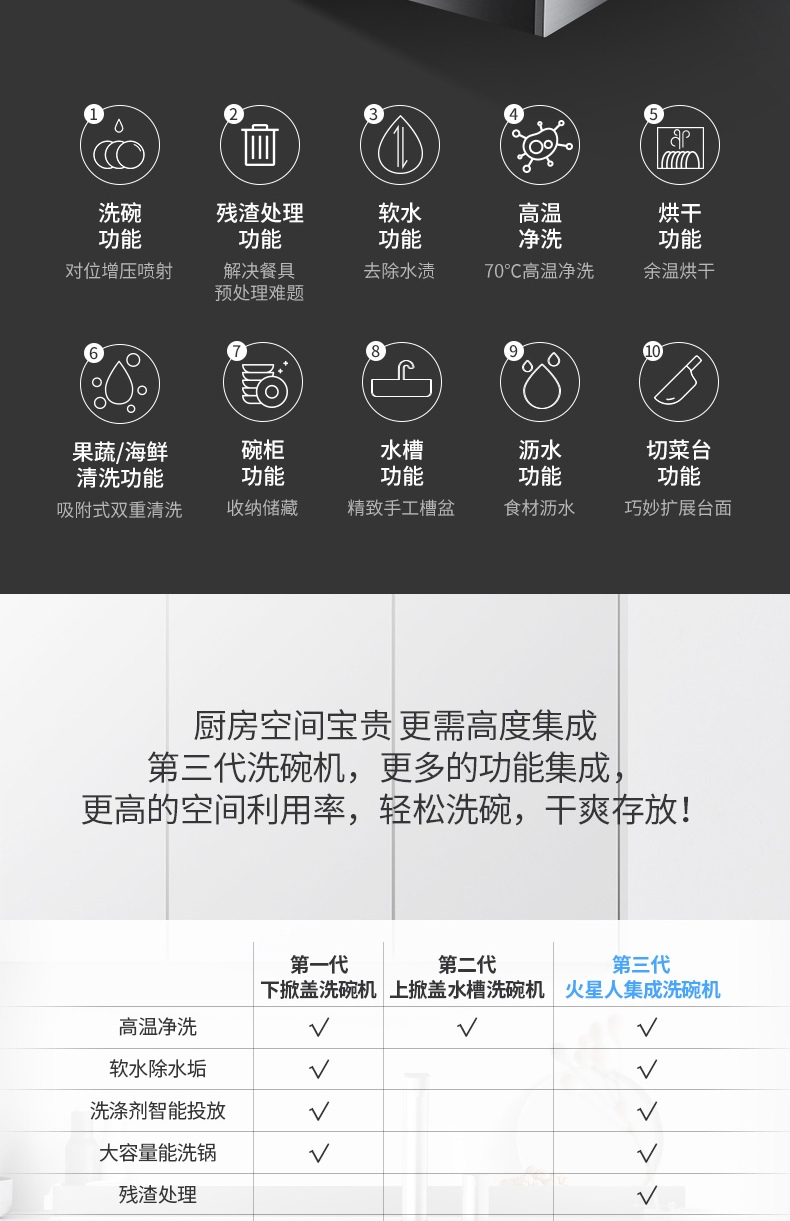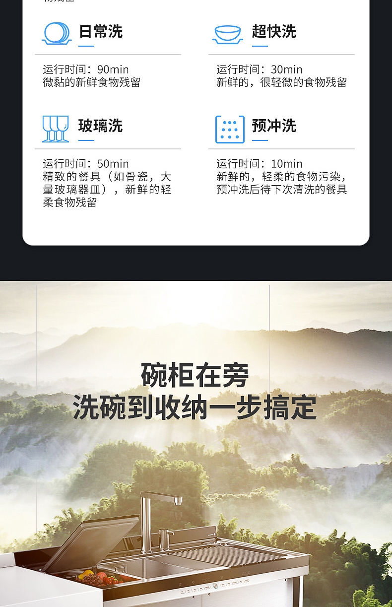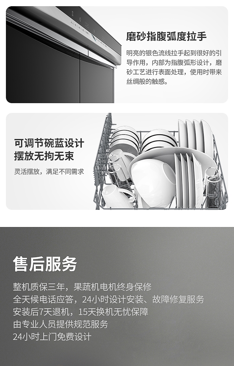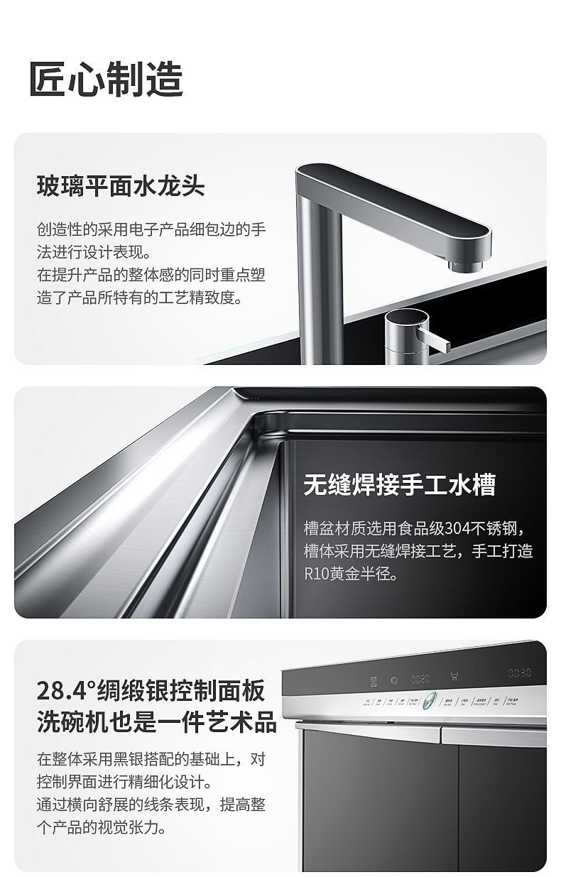 水槽洗碗机开创性地将洗碗机、水槽、果蔬清洗机三种产品形态整合于一身:将传统洗碗机的空间留给了其他厨电用品,极大提升了厨房利用效率;水槽一体化安装,不拆橱柜,不改水电,利用原有水槽,安装便利,节省工程成本。一台厨电,三种用途