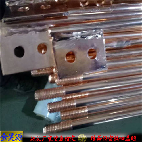 垂直接地极铜层结合度:经附着力试验,除虎口钳钳口咬合处出现剥落铜层,其余部分铜钢结合良好,未出现剥离现象。由于有一定厚度的锌层可以作为牺牲阳极体,可保护接地装置、地下金属物和相关钢铁设备等不受腐蚀。水平连铸铜包钢接地极通过深入接地把雷电流引到地下。垂直接地极建造成本低:对比传统上采用纯铜接地棒、接地带的建造方式,成本大幅度下降。连接管:棒与棒之间可以采用铜制连接管连接,具有很好的防腐效果。棒与棒之间接触紧密,在接地棒打入地下或采用驱动钻钻入地下时驱动力直接作用于接地棒。分为螺纹连接和非螺纹连接。电气性能更佳:表层紫铜材料优良的导电特性,使其自身电阻值远低于常规材料。.同轴连接器:材质:黄铜末端:采用JHY特制钻头(连接螺栓)连接,以便于将棒打深。