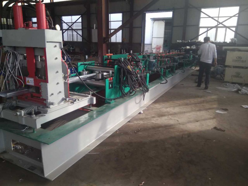 矫平机由板料导入装置、引板驱动辊、两侧可调的导向装置、矫平辊等组成。它由单独一个电机驱动,速度稍慢于主驱动电机,在减速机轴头安装超越离合器,开始装料时电机驱动上料;当工件送入主驱动辊后,由于超越离合器的作用,前驱动电机处于被动状态。当钢板被剪断后,由于主驱动电机比前驱动电机速度快,自然拉开一段距离;当一批工件加工完,钢卷需要中途退出时,前驱动电机停止,等前面的工件完全被送出成型辊后,前驱动电机反转退出钢卷。