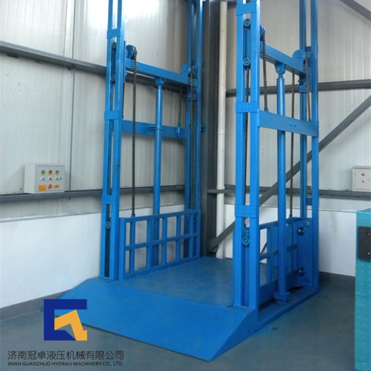 导轨式升降机是一种非剪叉式液压升降机械设备·用于二三层工业厂房,餐厅,酒楼楼层间的货物传输·最低高度在150-300mm,尤其适合不能开挖地坑的工作场所。并且无须上部吊点,形式多样化(单柱,双柱,四柱)。设备运行平稳,导轨式升降机的导轨一般为槽钢、工字钢,方管焊接制成,操作简单可靠,货物传输经济便捷。不能到达要求的场合等比较难解决的狭小空间,可以量身打造高效率的送货平台,产品液压系统设置防坠、上下层门互动连锁,各楼层和升降台工作台面均可设置操作按钮,实现多点控制。产品结构坚固,承载量大,升降平稳,安装维护简单方便,是经济实用的低楼层间替代电梯的理想货物输送设备。根据升降台的安装环境和使用要求,选择不同的可选配置,可取得更好的使用效果。