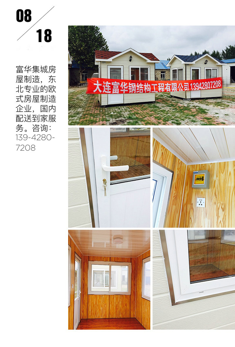 主营项目:承接钢结构、轻钢别墅、欧式活动板房、欧式轻体房、轻体房、执勤岗亭、欧式岗亭、各种不锈钢岗亭、保安亭、金属岗亭、移动拖车营房、建筑围挡、多功能环保房屋、轻钢房、移动环保厕所、生物厕所、自动打包厕所、免水冲移动卫生间。环保垃圾房,工具房,设备房,环卫休息室房屋制造商,富华工程始终坚持以低的利润,为客户做出好质量的工程。我们保证让用户使用的放心,购买的划算。