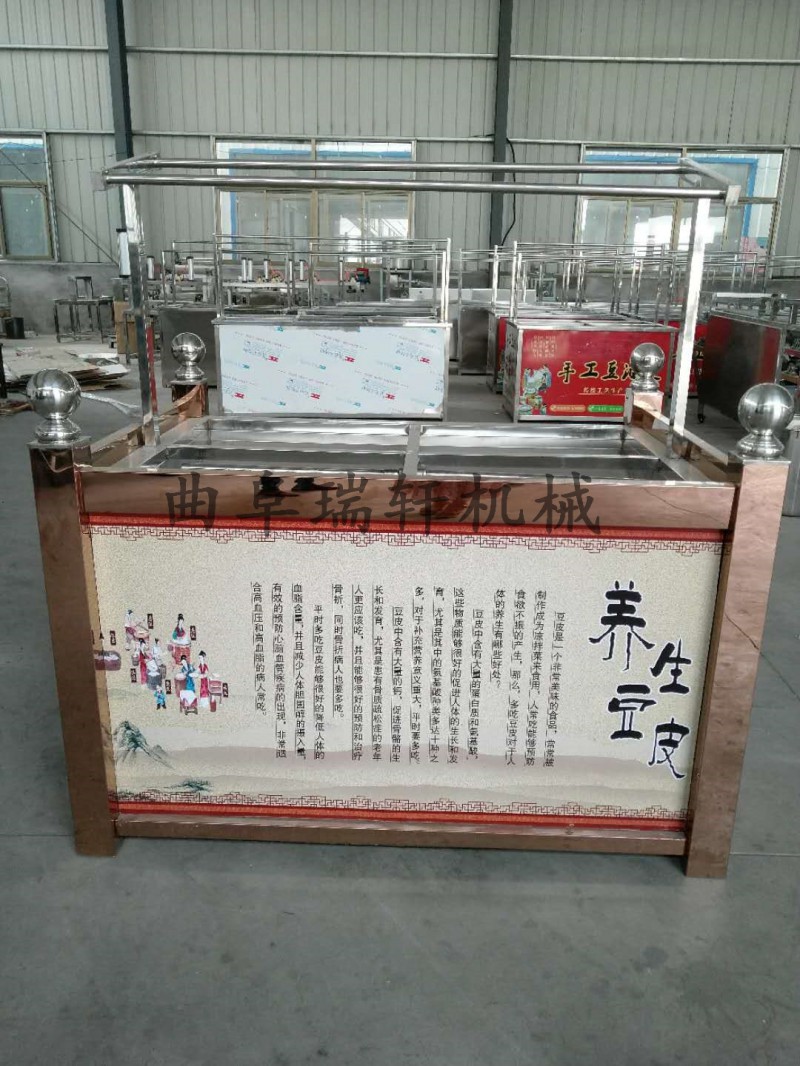 2.浸豆磨浆:把去衣的黄豆放入缸或桶内,加入清水浸泡,并除去浮在水面的杂质。水量以豆置容器不露面为度。浸水时间,夏天约20分钟,然后捞起置于箩筐上沥水,自动腐竹设备厂家,并用布覆盖豆面,让豆片膨胀。气温在35℃左右时,浸后要用水冲洗酸水;冬天,若气温在0℃以下,浸泡时可加些热水,时间3~40分钟,排水后置于缸或桶内,同样加布覆盖,让其豆片肥大。通过上述方法,大约8小时左右,即可以磨浆。磨时加水要均匀,使磨出来的豆浆细腻白嫩。炎夏季节,蛋白质极易变质,须在磨后3~4小时内把留存在磨具各部的酸败物质冲洗净,以防下次磨浆受影响。黄豆营养丰富这是众所周知的。而油皮不止有黄豆的营养,还有它特有的味道,吃法更是多样化,可炸、可煮、可炒,方便携带,利于保存。油皮在国外是没有的,价格更高。