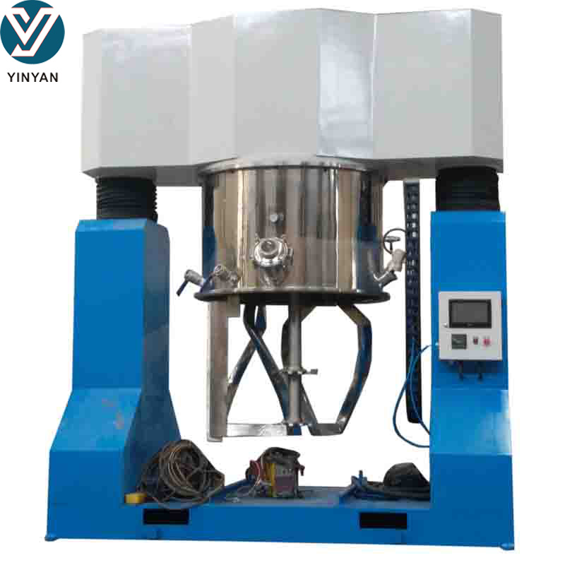 双行星搅拌机工作原理:高粘度搅拌机装有低速搅拌部件和高速分散部件,低速搅拌部件采用行星齿轮传动,搅拌桨在公转时也自转,使物料上下及四周运动,从而在较短的时间内达到理想的混合效果.高速分散部件与行星架一起公转,同时高速自转,使物料受到强烈的剪切与分散混合,其效果为普通混合机的几倍.分散部件分单分散轴和双分散轴,客户可根据需要选用.二个双框搅拌器在桶体同时公转并自转,可实现抽真空,加热,冷却,根据情况可实现转速调节.配多个搅拌桶可1机多桶操作.匹配压料机让出料更方便