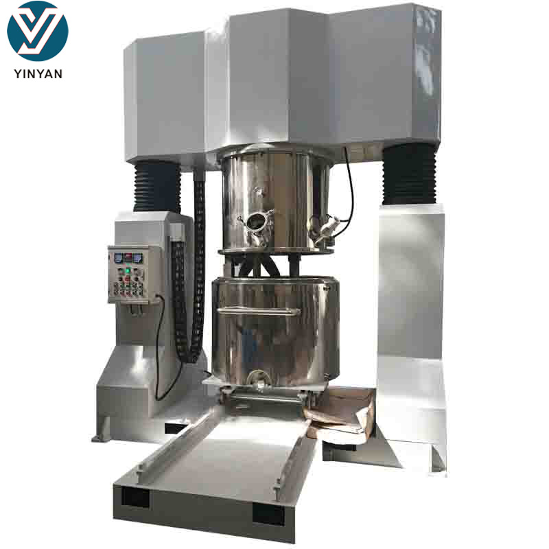 无锡银燕设计制造的双行星搅拌机由减速电机、行星架、搅拌器、刮壁器、料桶、液压升降系统、以及机架等构成。行星架转动时,带动箱内的搅拌轴、分散轴(选配)围绕料桶轴线公 转的同时高速自转,从而使物料受到强烈的剪切、捏合作用,达到充分分散和混合的目的;在行星架上有一刮壁刀随行星架转动,紧贴桶壁不断的刮拭,桶壁经大型 立车精加工后,再经大型自动抛光机抛光,以确保行星架上的活动刮刀在旋转时把桶壁的物料完全刮掉,使桶壁无滞留料,提高混合效果。是一款适用于高粘度物料的设备,该设备由低速搅拌器和高速 分散器组成,具有良好的混合、反应、分散、溶解作用,特别适用于固-液、液-液相的分散、混合;由于其极大的输出扭矩,特别适合粘度较大的产品,比如胶黏 剂、硅胶、锂电池浆料等;同时设备带刮壁刮底功能,无死角,无残留。