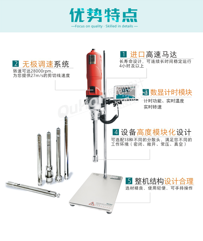 Ø 设备高度模块化设计:可选配18种不同的分散头,满足您不同的工作环境(密闭、敞开、常压、真空)
