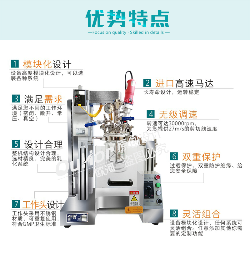 Ø 整机结构设计合理,选材精良,高剪切乳化和超声乳化相结合