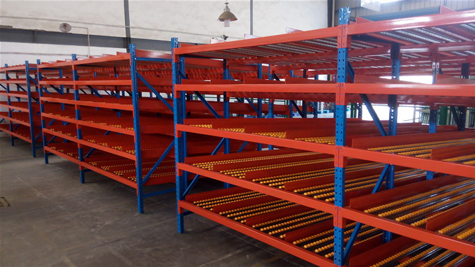 流利式货架又称滑移式货架, 流利式货架又称滑移式货架,采用辊轮铝合金 、钣金等流利条 利用货物台架的自重 从一边通道存货 另一边通道取货实现先进先出 存储方便 以及一次补货多次取货。流利架存储效率高 适合大量货物的短期存放.
