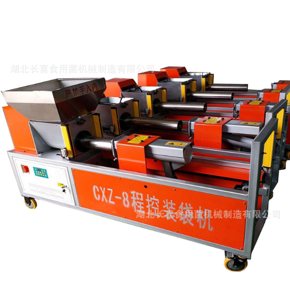 装袋机的工作原理是 把塑料袋套在出料筒上。拨动开关,防涨筒自动前行到出料桶,终点自动接通电磁离合器启动主电机转动绞龙,推动物料(木屑,棉籽心,玉米壳,稻草等)进入塑料袋有防涨筒保护塑料袋的破损,达到了良好的保护效果,以降低微孔率。