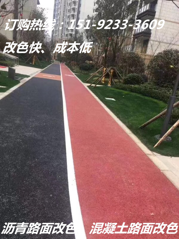 甘肃酒泉路面改色剂为成品料,不需要再做任何的加工,施工之前将桶内的假沉淀搅拌均匀即可,使用无气喷涂机直接喷涂施工,每公斤喷涂两遍可施工2.5个平方。
