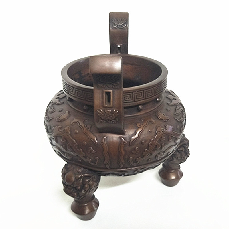 介绍:此熏炉是故宫宝鼎式,造型古朴典雅,上面宝鼎式两层结构,炉口连接处有凹槽可卡嵌,最下层是底座。朝冠耳高贵庄严,炉身饱满,浮雕祥云纹,三足圆硕,上部浮雕兽面纹,怒目圆睁,上层融入故宫房檐设计,古色古香,镂空出烟孔外环绕双龙戏珠浮雕,传统喜庆,镇宅平安。香炉不仅是吉祥美观威严的象征,而且还具有威慑妖魔清除灾祸的作用,香炉为你累积福慧,事事圆满。