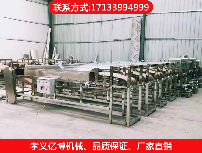全自动粉皮机生产工艺流程 全自动粉皮机需厂房八间,长24米,宽3米,高4米,热风炉房在车间外另建。  原料入机 → 搅拌自动上料 → 下料到不锈钢带成型 → 蒸箱煮熟 → 冷却 → 从不锈钢带脱离 → 烘干箱烘干 → 切割 → 烘干 → 排潮 → 包装。
