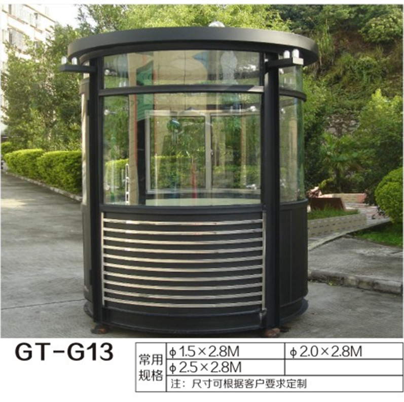 岗亭主材:不锈钢主柱、外封板为不锈钢封板,不锈钢推拉窗,5厘厚耐用玻璃
