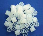 特点:流化床填料是MBBR工艺 的核心。填料的性能好坏,直接影响到挂膜的难易程度,反应器中生物量的多少,反应器处理效果的好坏。而MBBR 所使用的填料多为聚乙烯或聚丙烯塑料填料,形状似小圆柱体(直径与高约为10250 mm 不等) 。圆柱体中心有十字支撑,外侧沿不同径向伸展许多尾翅。载体密度略低于水( 0. 9220. 97 g/ cm3 ) , 填料比表面积大( 1602500 m2/ m3) 。表面易于生物膜附着生长,而且巧妙的结构设计使填料在使用时不结团、不堵塞,始终具有理想的空隙率,并具有良好的通气、过水性能。